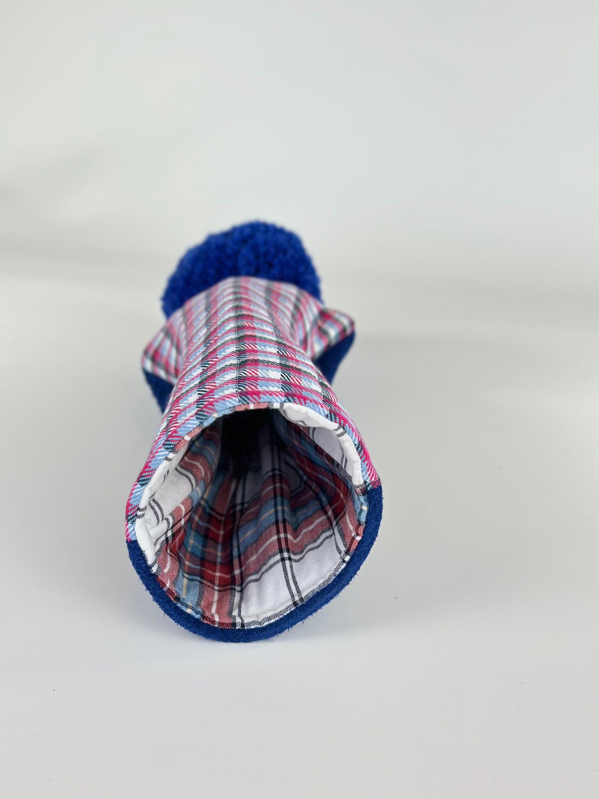 Add a jolt of bold color and timeless texture to your golf bag with this one-of-a-kind handmade headcover. Crafted with quilted flannel and a contrasting Royal Blue Suede, this piece fuses athletic energy vintage preppy flair. The iconic oversized wool pom-pom on top is hand-tied to deliver playful personality while protecting your club heads in style. This fully custom design is a standout on and off the course. Durable, snug-fitting, and built for golfers who don’t blend in.