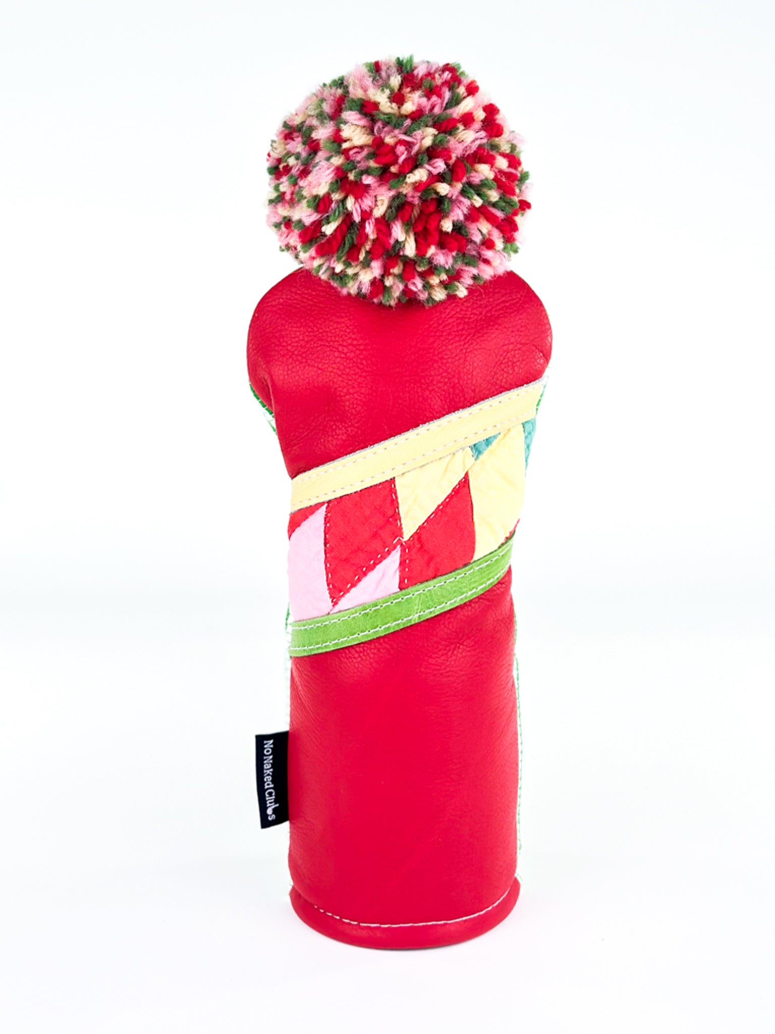Bring a pop of color and vintage flair to your golf bag with the Patchwork Parade head cover. This one-of-a-kind design features a lively blend of classic green-and-white gingham on one side and a vibrant quilted pattern of leather and fabric on the other, showcasing an angled patchwork of a vintage quilt in cheerful hues—pink, red, yellow, and mint green. A coordinating pom pom crowns the top in a festive mix of reds, greens, and soft blush, adding personality and charm to your gear.