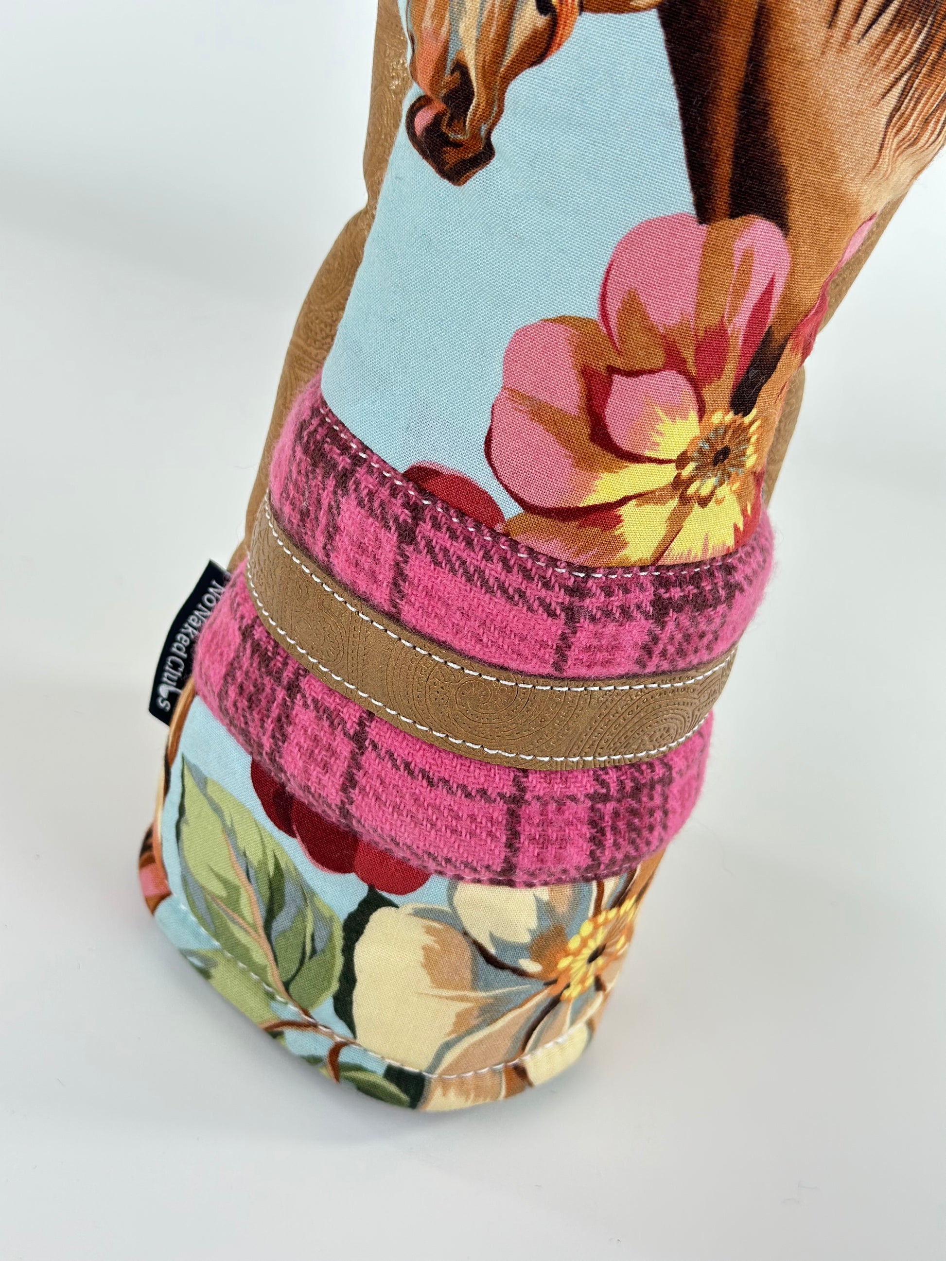 This handcrafted, one-of-a-kind headcover is perfect for the golfer who feels just as at home in the stables as on the course. The front panel features a gorgeously illustrated chestnut horse surrounded by soft florals, framed by an accent band of pink plaid wool and tan tooled leather. The back is a full panel of that tooled leather material, adding warm western tones and vintage equestrian styling.