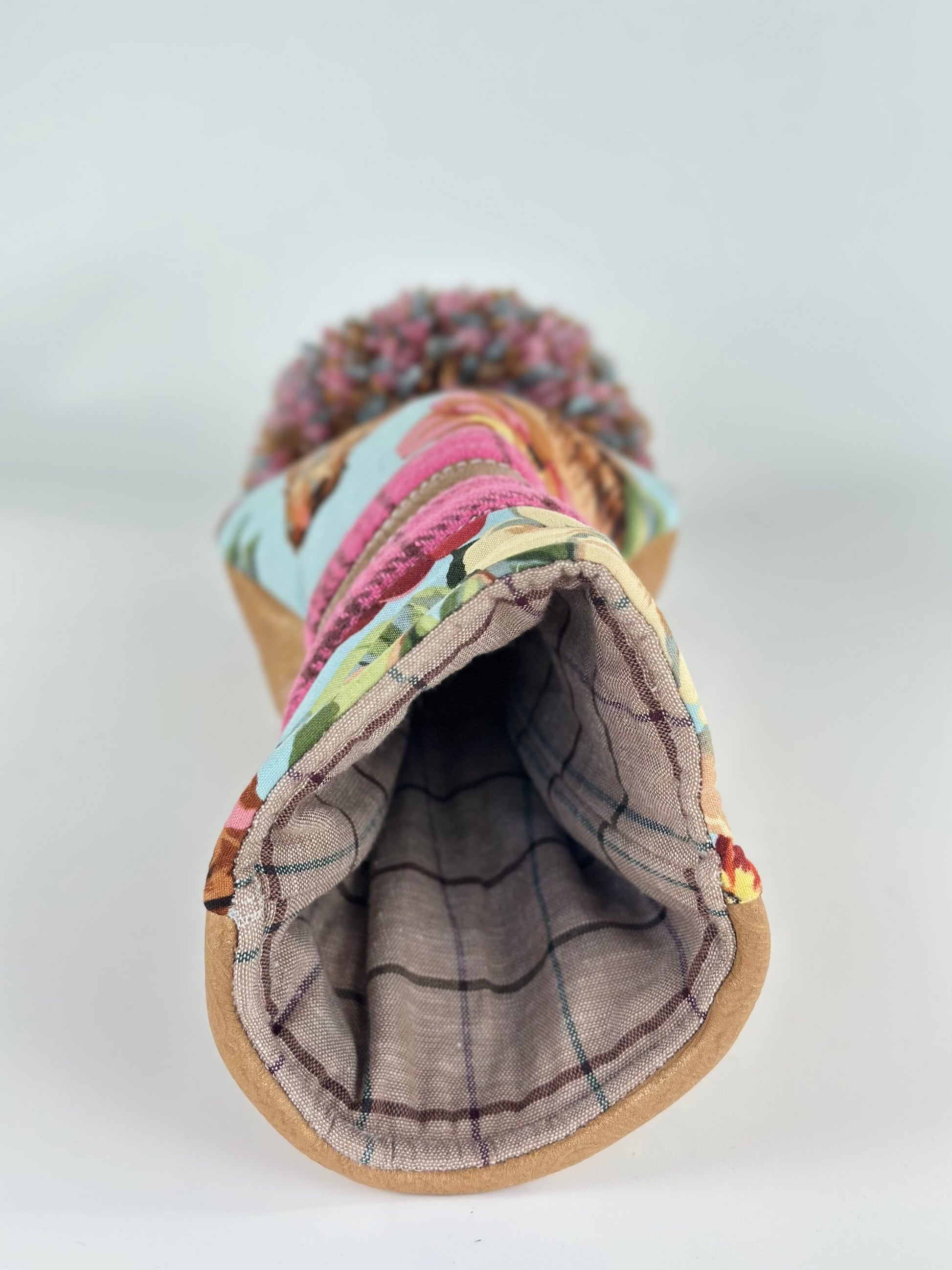Inside, your club is cushioned by a soft neutral flannel lining in a subtle plaid, giving a cozy, barn-chic finish. At the crown, our signature pom-pom bursts in a multicolor blend of dusty rose, lavender, teal, and cocoa—tying together the entire color palette like a wildflower bouquet.